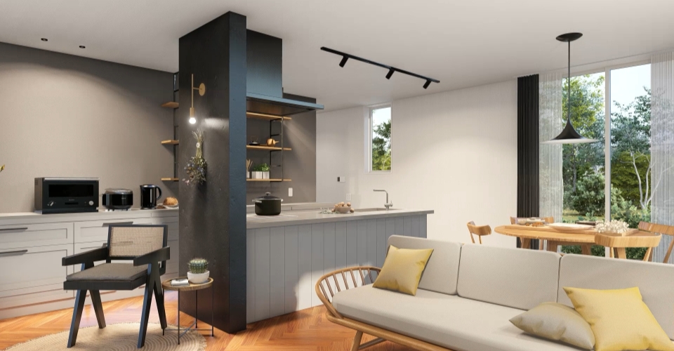 また、木材特有の温かみに加え、アイアンの質感が空間をキリッと引き締めます。